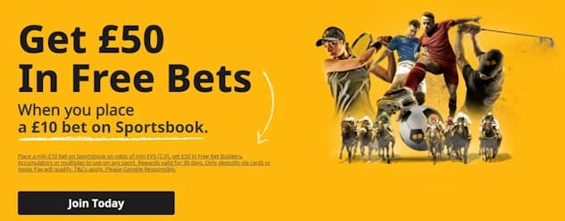 Betfred offers a generous £50 in free bets when you sign up and bet at least £10. The event you bet on must have odds of 1/1 or longer, and be used within 7 days. Betfred will add bet credit to your account after settling your qualifying bet, which consists of three £10 free sports bets and two £10 free acca bets. Betfred is one of the best minimum deposit betting sites available. You can open an account by depositing just £5.